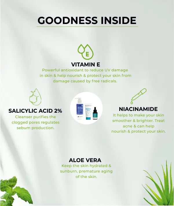 Salicylic Acid Serum: An ultimate serum that exfoliates and unclogs pores, reducing acne and promoting clearer, smoother skin. Salicylic acid is renowned for its acne-fighting properties, making it a key ingredient in this kit.